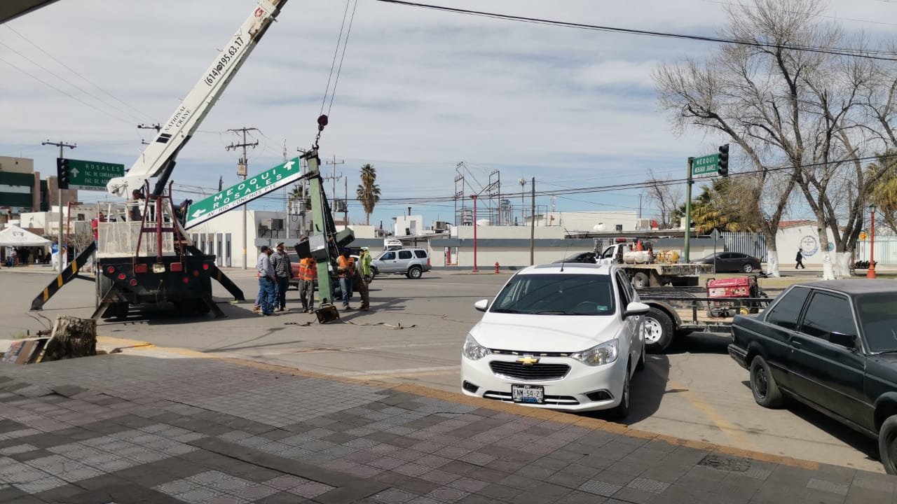 Se trata del semáforo que se encuentra sobre la avenida agricultura y Río Conchos, mismo que deberá ser remplazado ya que se dañó la base de concreto y se encontraba en riesgo de colapsar.