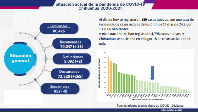 La Secretaría de Salud de informó que hay registrados hasta el momento 80 mil 426 contagios de covid en la entidad, de los cuales, en las últimas 24 horas se confirmaron 139 nuevos casos de contagio, 70 mil 047 (+83) casos recuperados, 73 mil 528 (+265) descartados y 853 (-9) casos sospechosos.