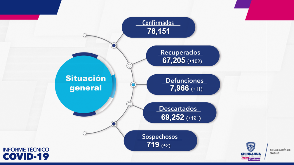 También se ratificó el aumento en el número de defunciones quedando en 7 mil 966; en recuperados suman 67 mil 205 (+102) recuperados, descartados son 69 mil 252 (+191) y contabiliza en 719 (+2) los casos sospechosos.