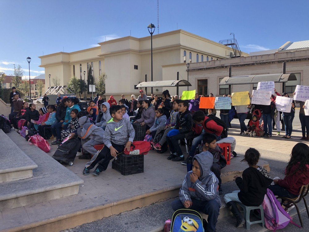 Chihuahua.- Padres de familia y alumnos de la zona Oriente, montaron un salón de clases con todo y alumnos afuera de la Secretaría de Educación.