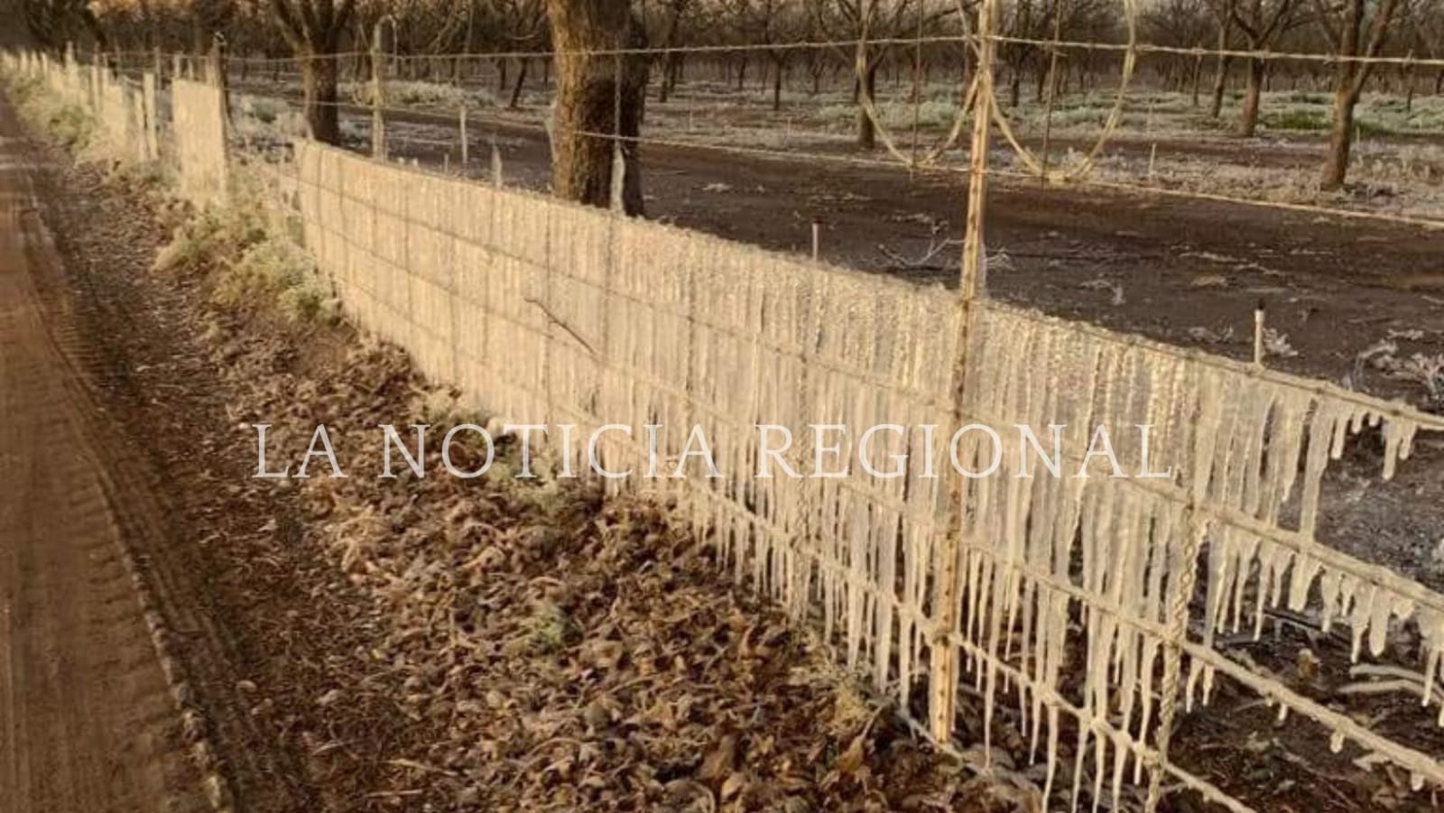El cultivo de alfalfa y nogales lucía prácticamente con una capa de hielo, que hasta las 8 de la mañana que fueron captadas las imágenes, todavía no se descongelaba.