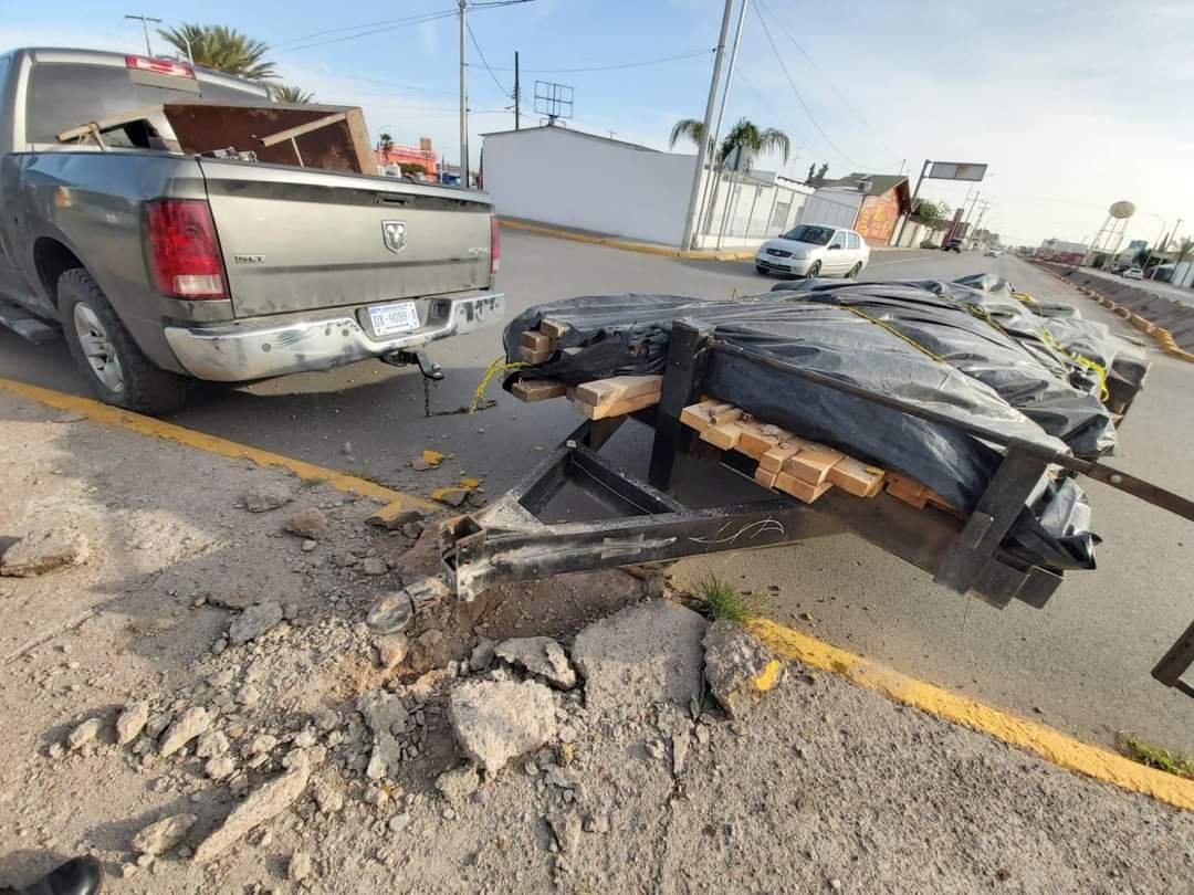 Un accidente que pudo ocasionar grandes daños se registró en la avenida Manuel Gómez Morín, dónde al conductor de una pick up de la marca Dodge se le desprendió la tráila que llevaba, ocasionando daños en la glorieta.