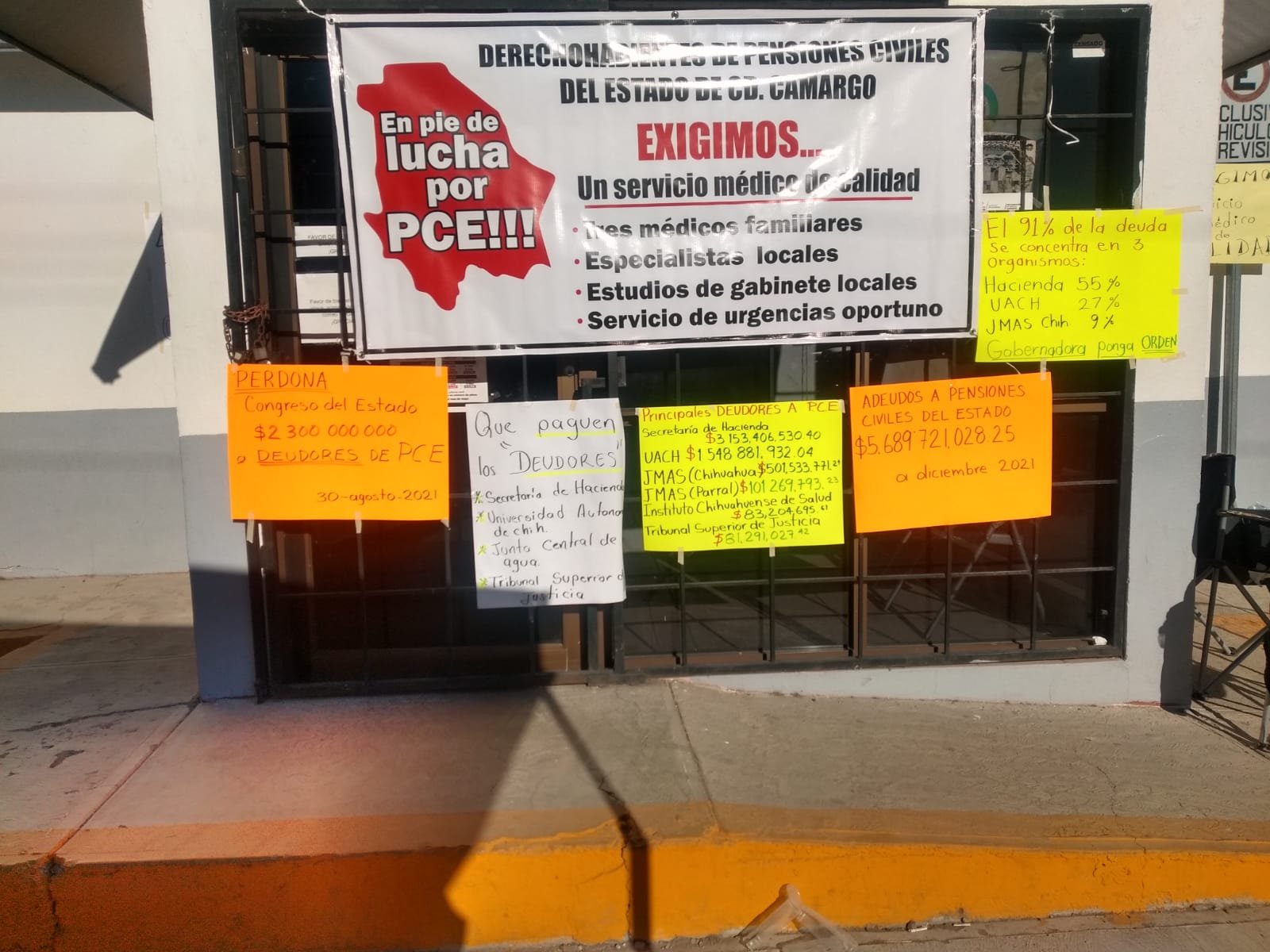 “Somos un grupo de maestros, la mayoría jubilados, y estamos exigiendo un buen servicio médico, pensiones civiles atiende a varias dependencias del estado, entre ellas la secretaría de hacienda, todas las juntas de agua y saneamiento municipales, el instituto chihuahuense de la salud, el tribunal de justicia, la UACH, entre otras, muchas de ellas desde años atrás no han aportado la cuota que le quitan a sus trabajadores vía nómina, la cual es para medicamentos y el servicio médico”, mencionó Rosalva Ramos, representante de los protestantes.