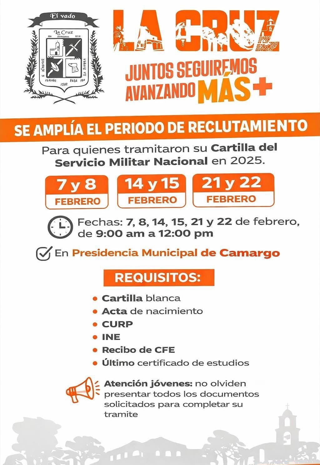 El Gobierno Municipal de La Cruz informa a los jóvenes que tramitaron su Cartilla del Servicio Militar Nacional en el año 2025, que se amplía el periodo de reclutamiento, por lo que deberán acudir a completar su proceso en las fechas establecidas.