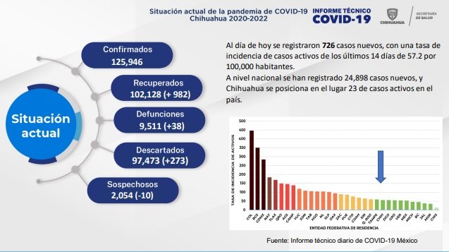 En las últimas 24 horas se reportaron 726 nuevos contagios por coronavirus y 38 decesos en la entidad, desde el inició de la pandemia se han acumulado 125 mil 946 casos positivos, 101 mil 128 (+982) recuperados, 97 mil 473 (+273) casos descartados, 2 mil 54 (-10).