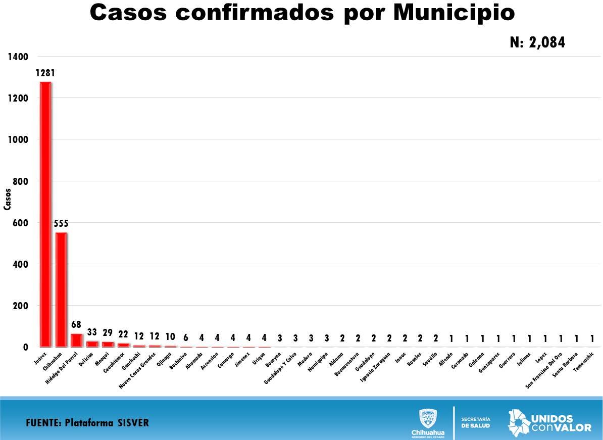 En Juárez se concentran mil 281 positivos, 555 en Chihuahua, 68 en Parral, 33 en Delicias, 29 en Meoqui, 22 en Cuauhtémoc, 12 en Guachochi, 12 en Nuevo Casas Grandes, 10 en Ojinaga, 6 en Bachíniva, 4 en Janos, 4 en Ahumada, 4 en Ascensión, 4 en Urique, 4 en Camargo, 3 en Namiquipa, 3 en Guadalupe y Calvo, 2 en Madera, 2 en Saucillo, 2 en Bocoyna, 2 en Buenaventura, 2 en Guadalupe Distrito Bravo, 2 en Ignacio Zaragoza, 2 en Janos, 2 en Rosales mientras que en Julimes, Guerrero, Temosáchi, Galeana, López, San Francisco del Oro, Santa Bárbara, Guazaparez y Allende con un caso cada uno.