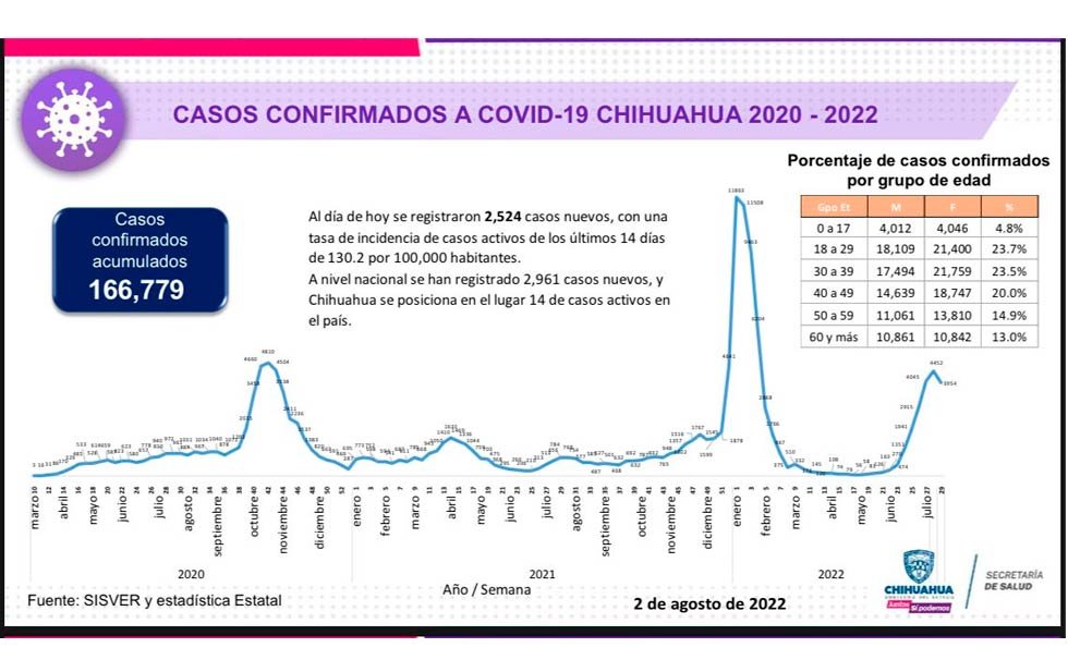 Los 2 mil 524 nuevos registros corresponden a los municipios de Juárez con 819, Chihuahua 913, Parral 159, Cuauhtémoc 71, Delicias 112, Nuevo Casas Grandes 60, Ojinaga 38, Camargo 28, Guachochi 10, Jiménez 19, Bocoyna 8, Meoqui 21, Saucillo 55 y Guerrero 4.