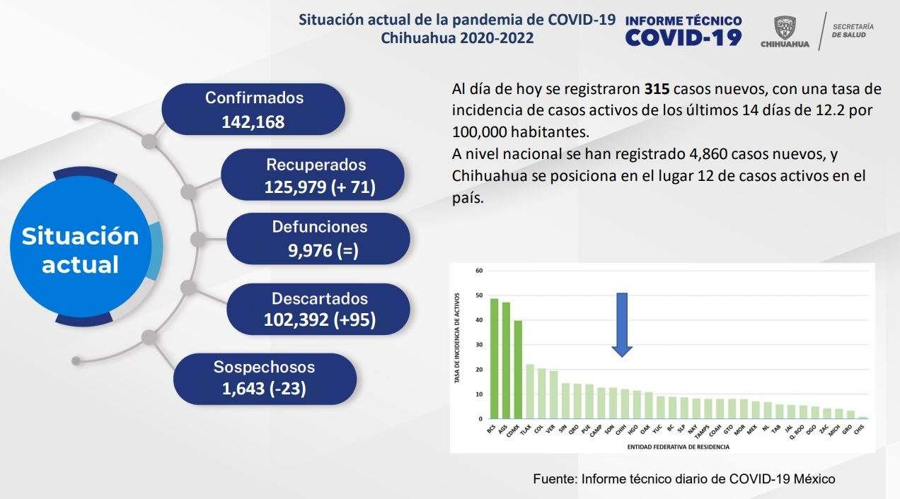 La cantidad de casos confirmados con este padecimiento ascendió a 142 mil 168 (+315) y estos casos nuevos se registran en los municipios de Juárez (+21), Chihuahua (+287), Parral (+3), Cuauhtémoc (+1), Nuevo Casas Grandes (+1), Guadalupe y Calvo (+1), Morelos (+1).