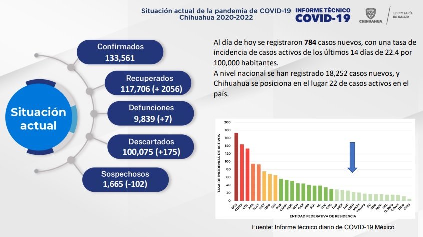 La cantidad de personas que han perdido la vida por COVID-19 ascendió a 9 mil 839 con 7 defunciones que corresponden a los municipios de Juárez (+5), Parral (+1) y Guadalupe (+1).