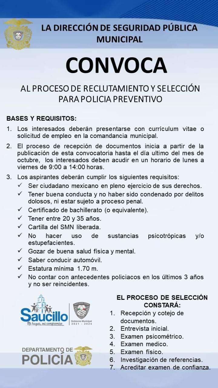La dirección de Seguridad Pública municipal de Saucillo abrió la convocatoria para el reclutamiento de policía preventivo.