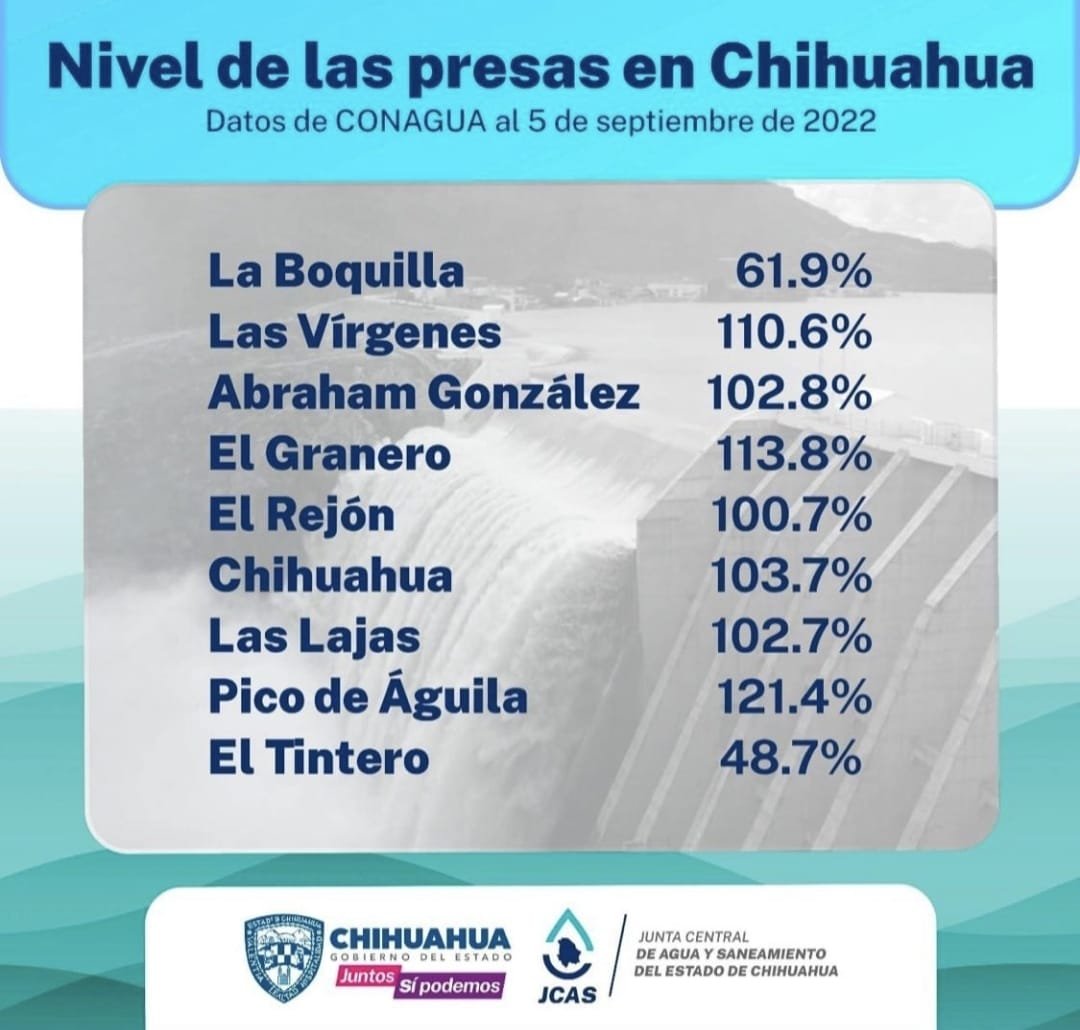 La presa Chihuahua se encuentra al 103.7 %, con una lámina de vertido de 028m.