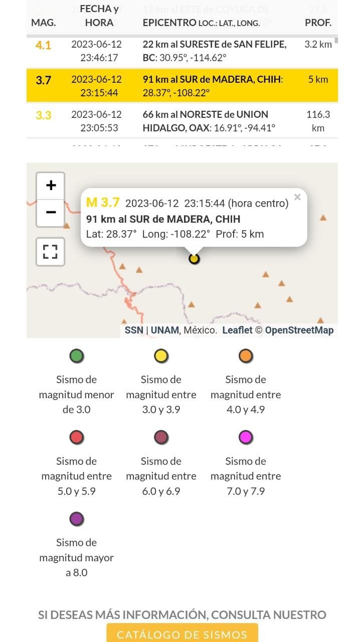 La Coordinación Estatal de Protección Civil (CEPC), dio a conocer que la noche de este lunes 12 de junio, se registró un sismo con magnitud de 3.7 grados en el municipio de Temósachic, de acuerdo con el reporte emitido por el Servicio Sismológico Nacional (SSN).