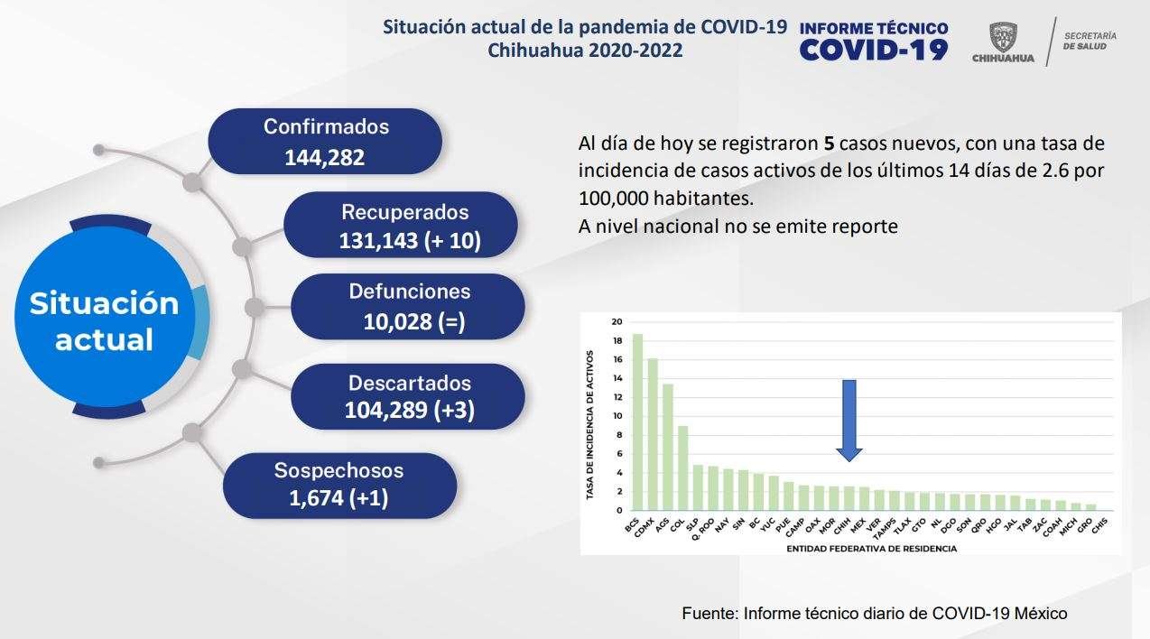 El Gobierno del Estado a través de la Secretaría de Salud de Chihuahua, presenta este 16 de abril el reporte COVID-19, que registra un acumulado de 144 mil 282 (+5) casos confirmados, 131 mil 143 (+10) casos recuperados, 104 mil 289 (+3) casos descartados y 1,674 (+1) casos sospechosos.