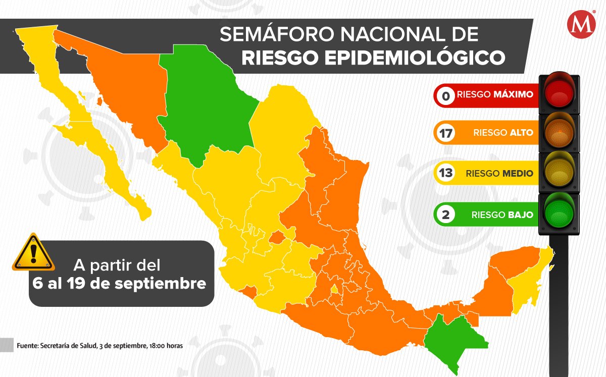 Sin estados en rojo, con 17 en naranja, 13 en amarillo y dos en verde es como México vivirá las semanas del 6 al 19 de septiembre de acuerdo con el semáforo de riesgo epidemiológico de la Secretaría de Salud. Como cada 15 días, la dependencia federal presentó el informe del semáforo epidemiológico de acuerdo con cada estado de la República.