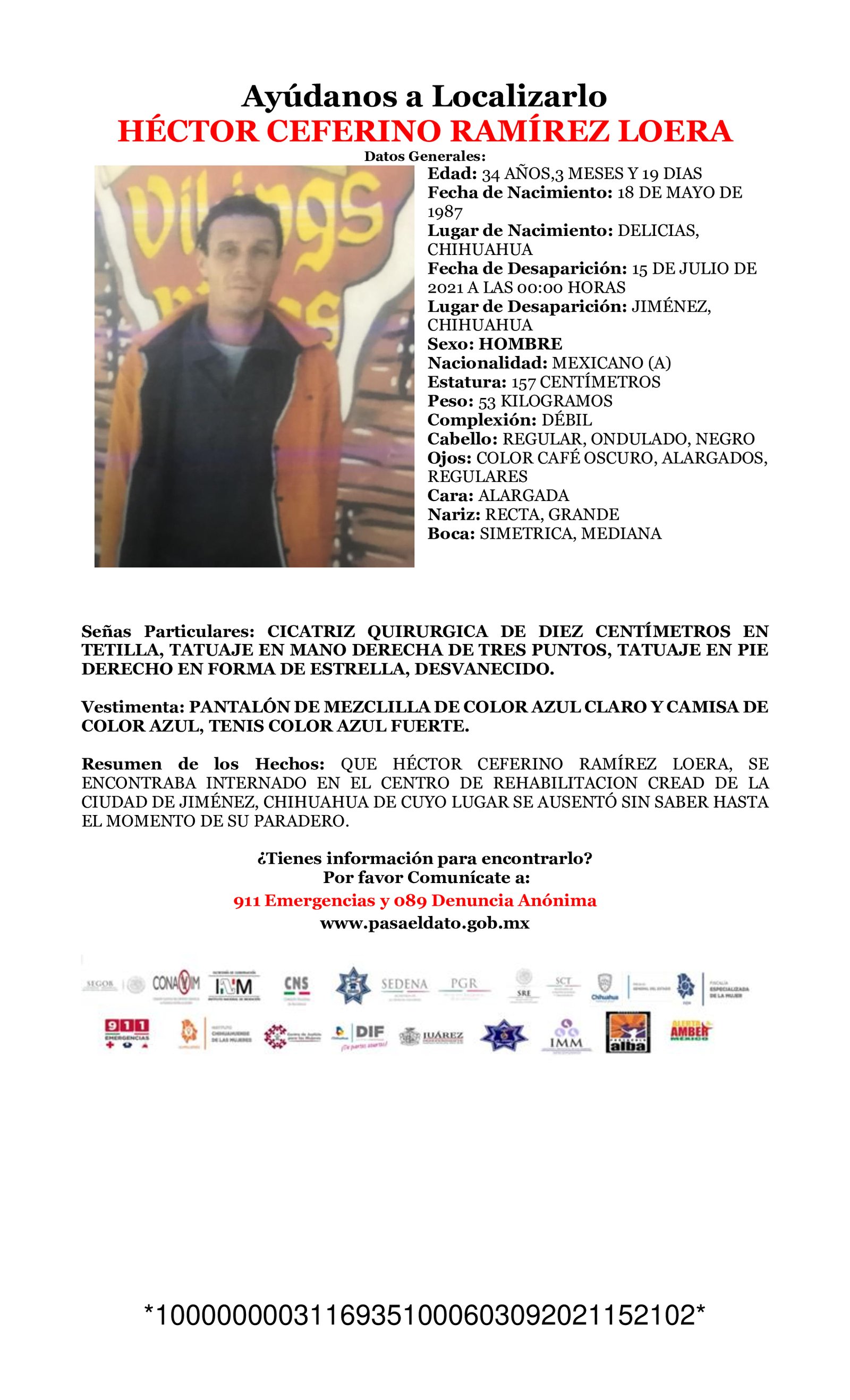 De acuerdo con las investigaciones, Héctor Ceferino Ramírez Loera se encontraba internado en el centro de rehabilitación Cread en la ciudad de Jiménez, lugar en donde se ausentó el día 15 de julio sin que hasta la fecha se tengan noticias de su paradero.