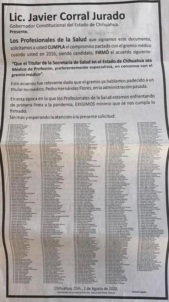 El desplegado de la doctora Olga Ponce, fue firmado por 557 médicos, en el cual piden que el gobernador Javier Corral Jurado cumpla con el compromiso de que el secretario de salud, sea un médico especialista.