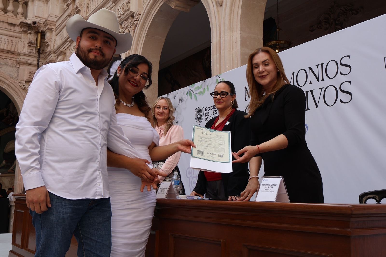 Como testigos de honor de la boda estuvieron Marcela Herrera, presidenta del Tribunal Superior de Justicia del Estado; Denisse Javalera, en representación Consejo Estatal de Población; la diputada Joss Vega por el Congreso del Estado y Roberto Fuentes, secretario del Ayuntamiento de Chihuahua.