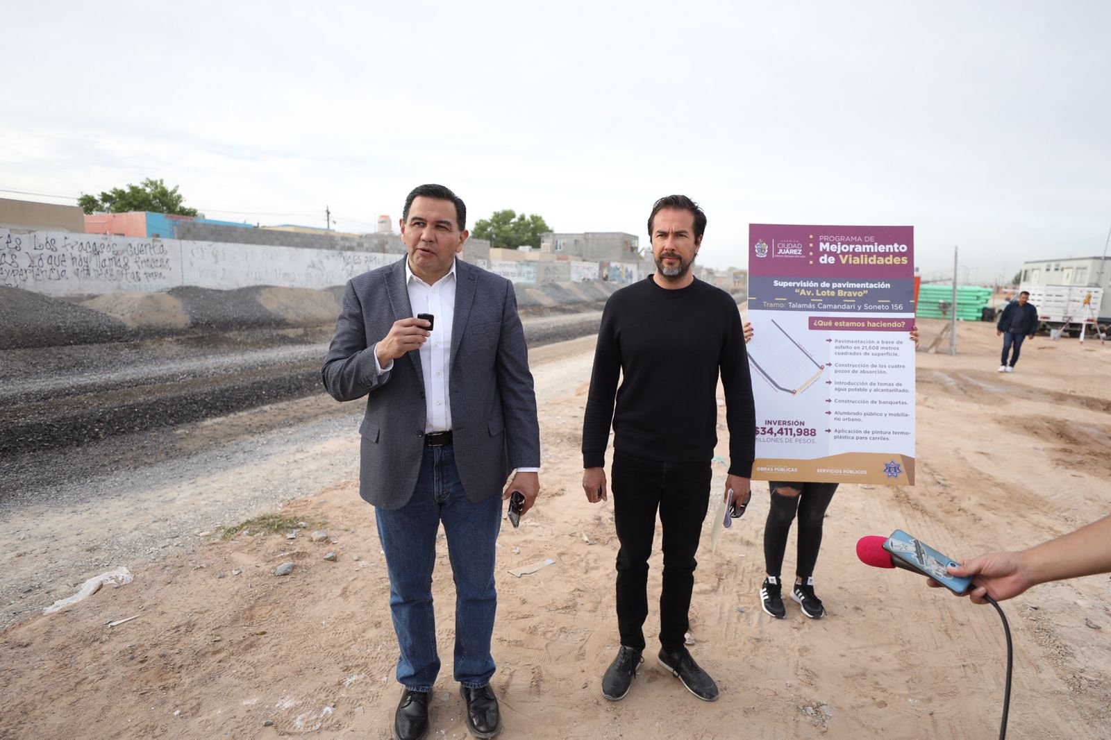 Esta mañana el Presidente Municipal, Cruz Pérez Cuéllar, estuvo en las inmediaciones de la avenida Lote Bravo para supervisar los trabajos que realiza la Dirección General de Obras Públicas para la pavimentación de dicha arteria en el suroriente de la ciudad.