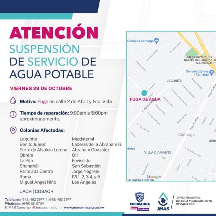 Debido a la misma fuga en la que se trabajaba el día de ayer en la calle 2 de abril y Francisco Villa, la cual continúo a pesar de los trabajos, este viernes la JMAS suspenderá el servicio de agua en algunas colonias.