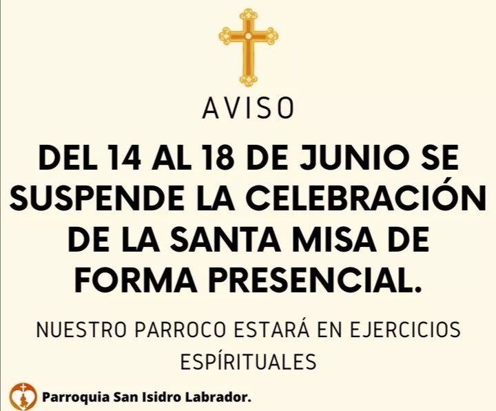 La parroquia de San Isidro Labrador informó que durante los días 16, 17 y 18 de Junio se suspenderá la celebración de la misa.