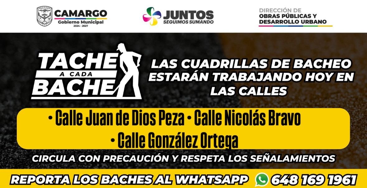 Tache a cada bache este jueves en Calle Juan de Dios Peza, Calle Nicolás bravo y Calle González Ortega en Camargo