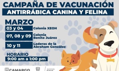 La jurisdicción sanitaria realizará una campaña de vacunación antirrábica canina y felina que iniciará mañana y estará en varias colonias del municipio de Camargo. El miércoles...