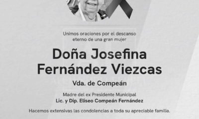 Esta tarde se dio a conocer sobre el fallecimiento de Josefina Fernández Viezcas de Compeán, madre del diputado federal y ex alcalde de Delicias, Eliseo Compeán...