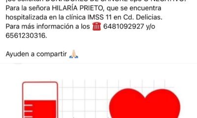 Se solicitan donadores de sangre O negativo para las señora Hilaria Prieto que se encuentra hospitalizada en la clínica 11 de ciudad de Delicias. Para más...