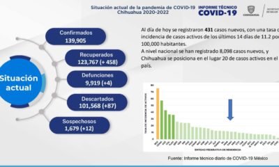 La Secretaría de Salud de Chihuahua, informó que en las últimas 24 horas se registraron 457 nuevos contagios de coronavirus y 12 decesos por dicho virus,...