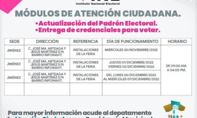 Los módulos de atención ciudadana del INE estarán en el municipio de Jiménez el miércoles 30 de noviembre, jueves 1 y viernes 2 de diciembre. Estarán...