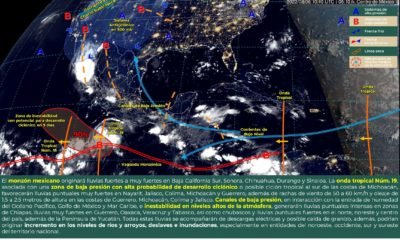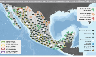 Para hoy, el monzón mexicano mantendrá la probabilidad de lluvias puntuales fuertes en Baja California Sur, Chihuahua y Durango y muy fuertes en regiones de Sonora...