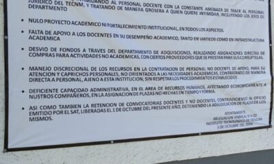 Al exterior de las instalaciones del Instituto Tecnológico de Delicias, fue colocada una lona pidiendo la destitución de la directora, firmada por la Delegación Sindical D-V-22....