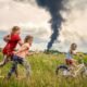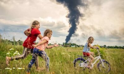 Una imagen de una niña en bicicleta junto a dos amigas en un prado en el noroeste de Ucrania, en “un momento de despreocupación bajo las...