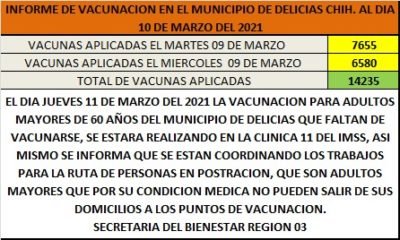 La Secretaría de Bienestar informó que hoy concluyó la aplicación de vacunas en Delicias. En total fueron 15 mil 235 vacunas las que se aplicaron desde...