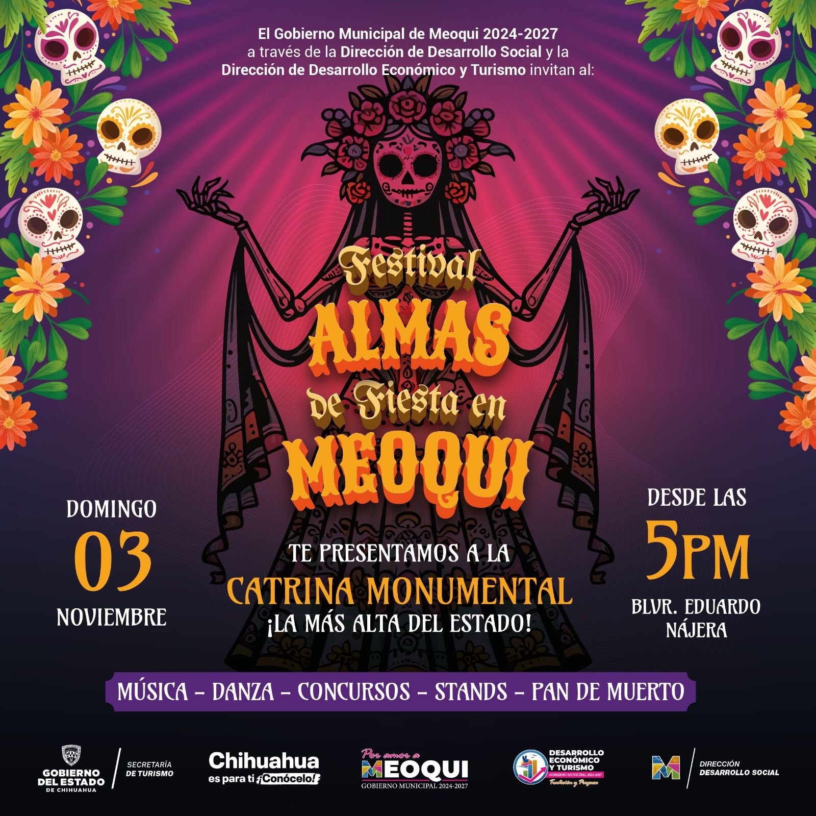 En Meoqui ya se encuentra todo listo para el Festival “Almas de Fiesta en Meoqui” en conmemoración por el Día de Muertos, el cual, dará inicio este 28 de octubre con el paseo “Entre tumbas y Flores”, en el cual se hará una visita guiada al Panteón Municipal para conocer las lápidas labradas en cantera que datan desde el año 1700, terminando con un paseo por campos de cultivo de flores de cempasúchil, crisantemo, garra de león, concluyendo el 3 de noviembre con un festival que contara con música, danza, concurso de mega tapetes, Pan de Muerto elaborado por la Escuela L’ Ecole Du Chef Feria de Emprendedores y la Catrina Monumental, la cual es la más alta del estado.