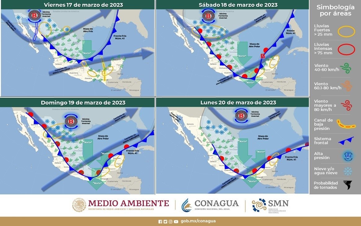 La Coordinación Estatal de Protección Civil (CEPC) informa que debido al ingreso de la Décima Tormenta Invernal y una corriente en chorro polar, se prevé la posibilidad de precipitaciones en forma de lluvias, nieve y agua nieve, además de vientos y un descenso marcado de temperaturas en gran parte del estado.