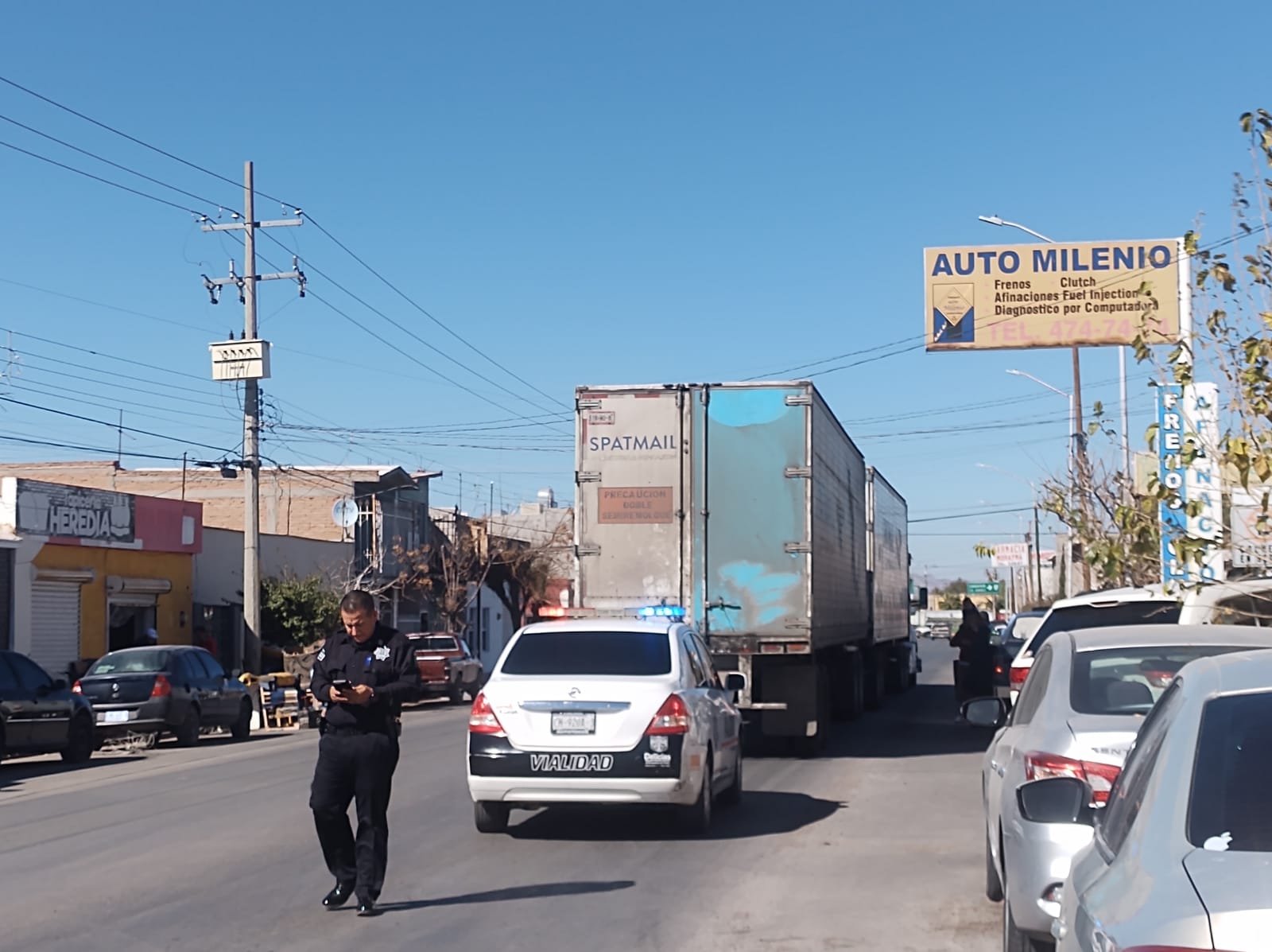 Hace unos minutos, agentes del departamento de Vialidad de Delicias se movilizaron a la avenida séptima, del sector norte, donde el chófer de un tráiler doble remolque derribó unos cables.