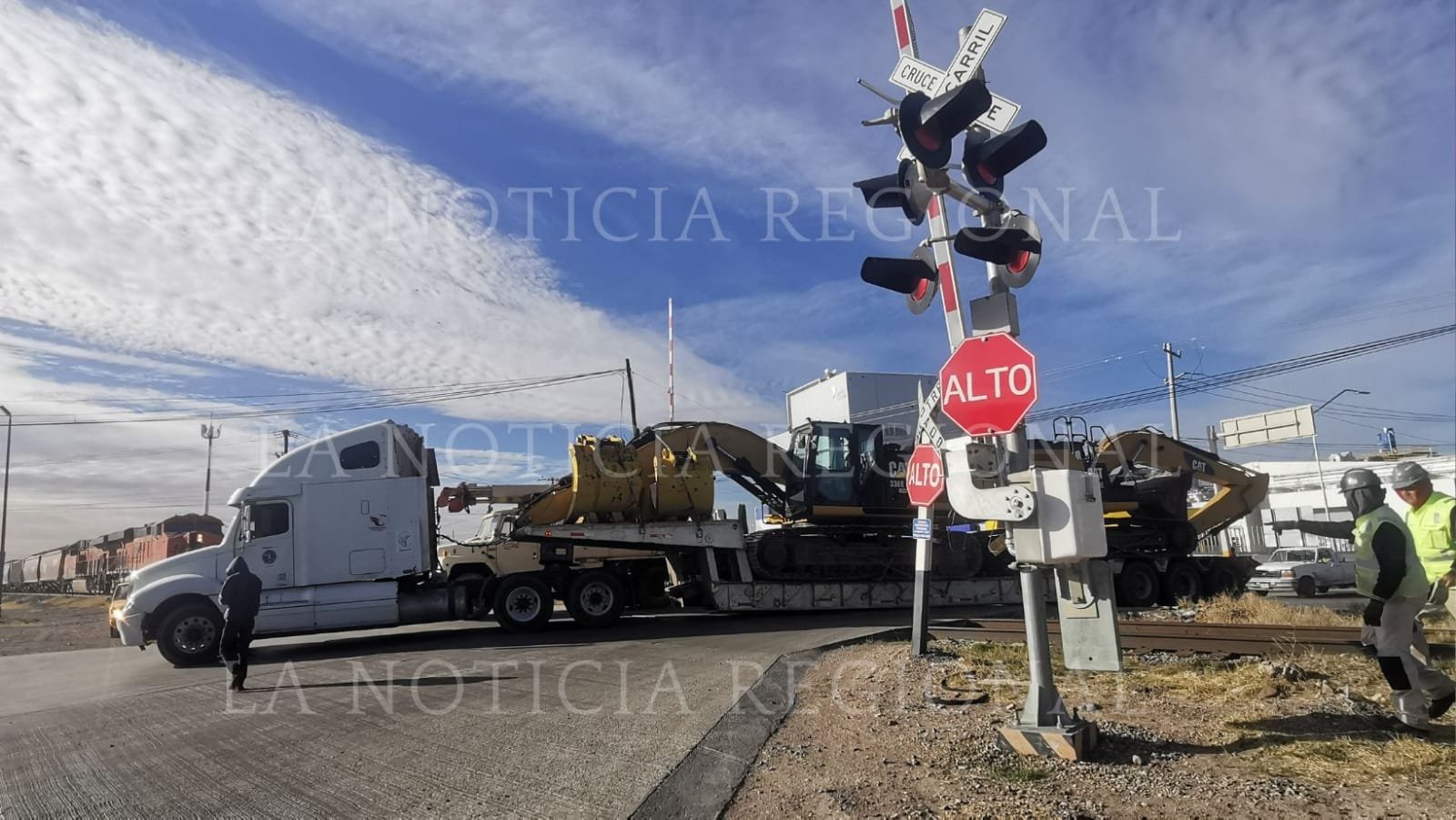 Un tráiler que transportaba maquinaria pesada quedó varado sobre las vías ferroviarias frente a la caseta de la Guardia Nacional y se logró evitar un choque con la locomotora.