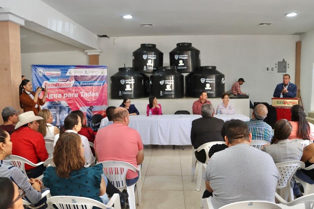 La Junta Central de Agua y Saneamiento (JCAS) entregó 225 tinacos de almacenamiento de agua potable a decenas de familias de las comunidades de Flores Magón, Ejido Benito Juárez, Ejido Constitución y la cabecera municipal de Buenaventura.