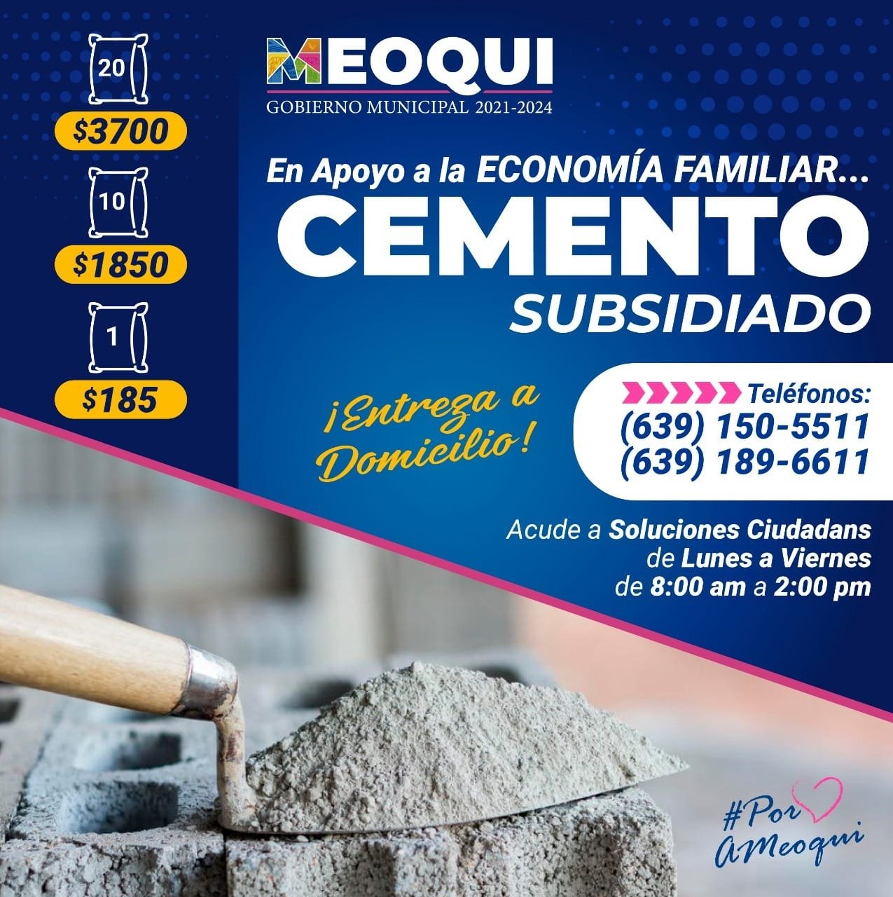 El Gobierno Municipal de Meoqui a través de la dirección de Soluciones Ciudadanas en coordinación con la Comisión Estatal de Vivienda, Suelo e Infraestructura (COESVI) hacen extensa la invitación a la ciudadanía meoquense para que aprovechen los últimos días del cemento a bajo costo con el programa “Juntos si podemos por tu vivienda”, con el motivo de que puedan realizar el mejoramiento a sus viviendas.