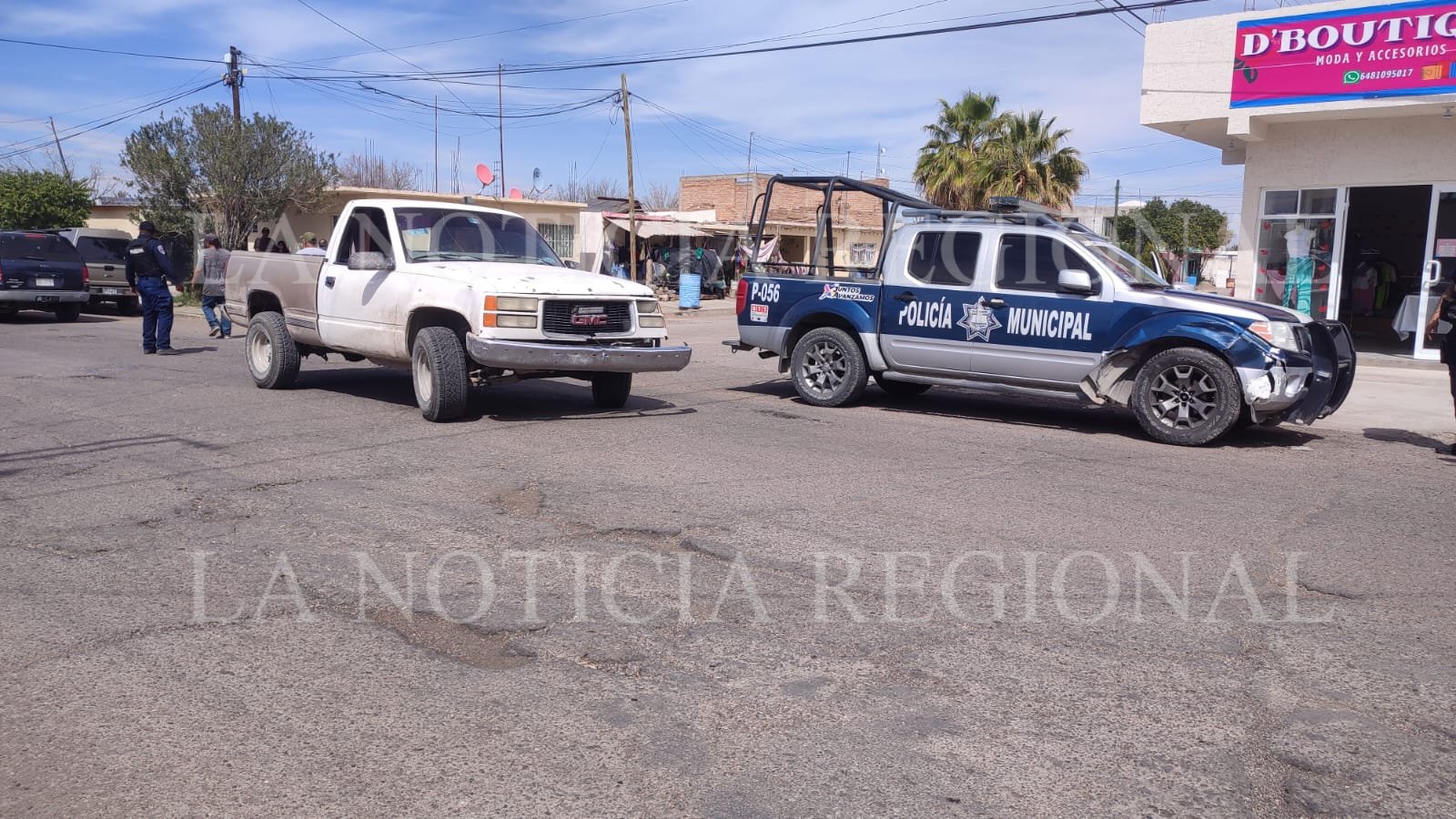 Esta tarde se registró un accidente vial tipo choque en el cruce de las calles Francisco Márquez y Juan Escutia, en el municipio de Camargo, en el que participaron una unidad de seguridad pública y una camioneta tipo pick up de color blanco.