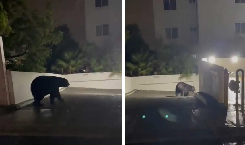 Posteriormente el oso baja por la rampa de lo que parece ser el estacionamiento de un edificio de departamentos y se pierde de vista.
