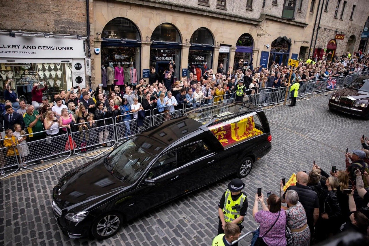 En Edimburgo, en la avenida Royal Mile, en el centro histórico de la ciudad, miles de ciudadanos se dieron cita desde muy temprano para ver pasar el cortejo, cubierto con el estandarte real de Escocia y una corona de flores, recogidas de los jardines de Balmoral.