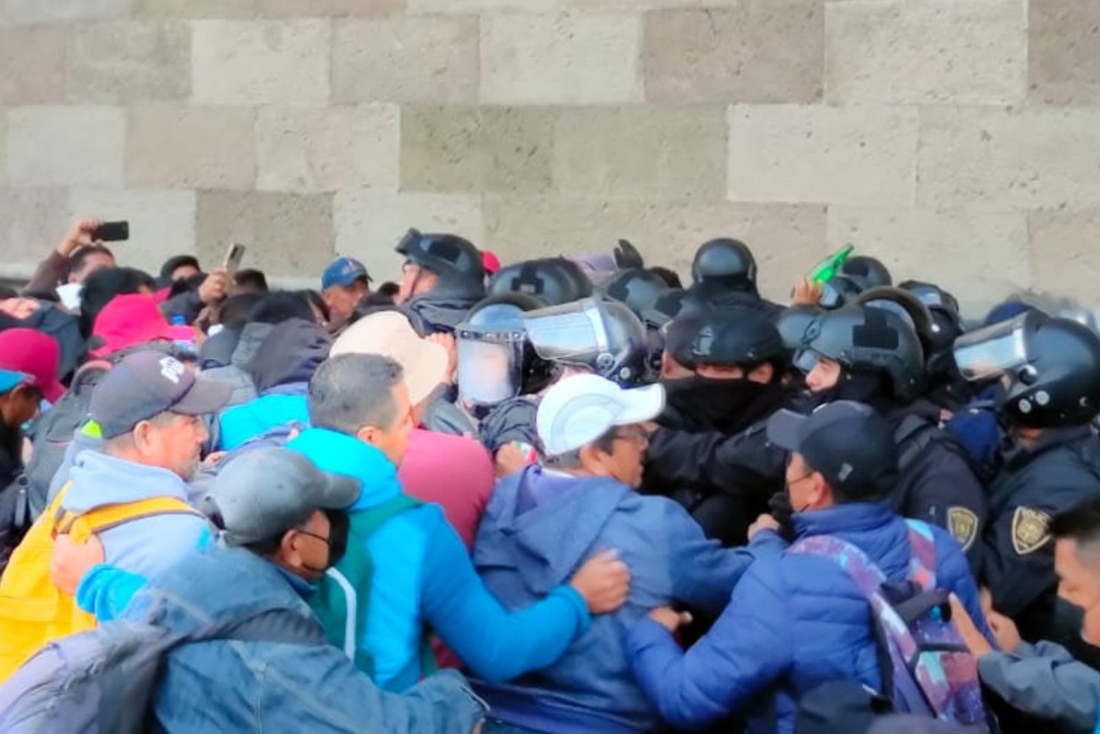 Los manifestantes, integrantes de la Sección 22 de la CNTE de Oaxaca, intentaron dar portazo en el acceso principal de Palacio Nacional, sin embargo, llegaron agentes de la Secretaría de Seguridad Ciudadana de la Ciudad de México (SSC CDMX).