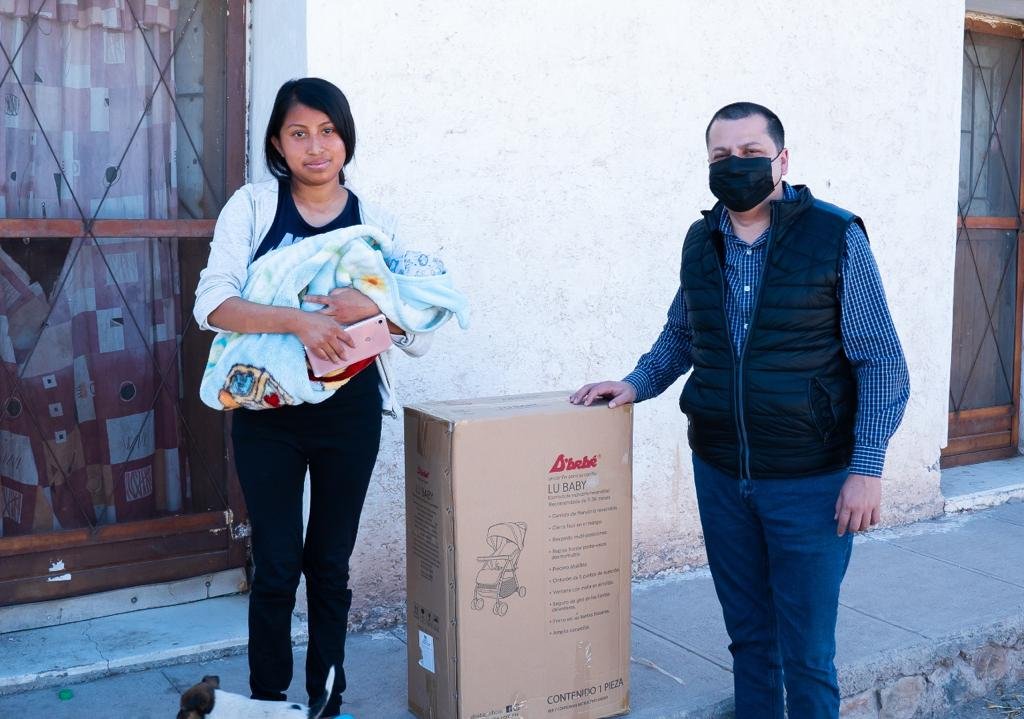En representación del Alcalde, Jesús Valenciano, Enrique Valenzuela, director de Desarrollo Humano y Bien Común, visitó a los orgullosos padres con la intención de felicitaros y regalarles un obsequio, el cual consistió en una carriola y una cobija.