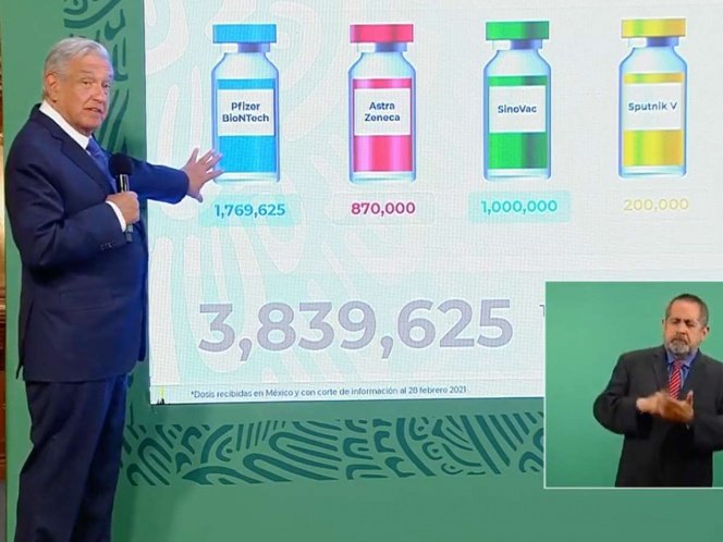 El jefe del Ejecutivo mostró una gráfica en la se señaló que de Pfizer se han recibido 1,769,625 dosis contra el coronavirus.