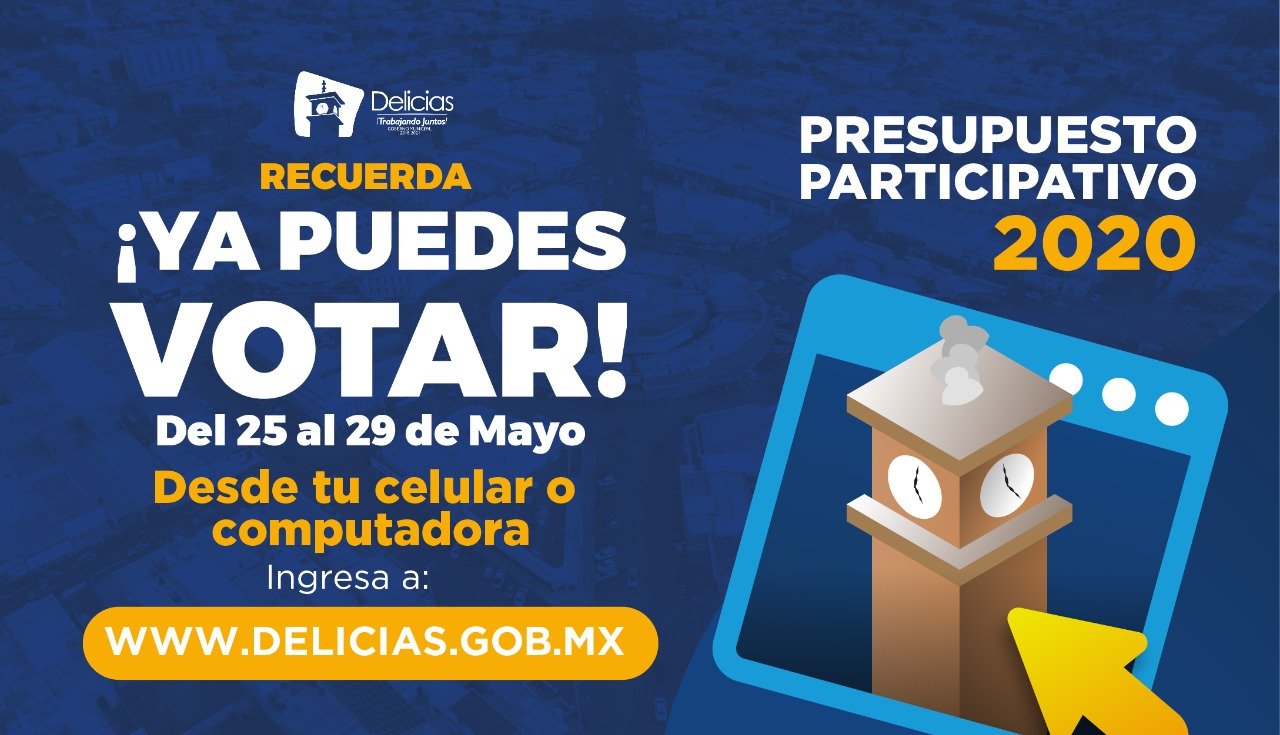 Delicias.- El Gobierno Municipal informa del inicio de las votaciones para participar en el Presupuesto Participativo 2020, por lo que invita a la ciudadanía a votar por los proyectos de su preferencia ingresando a la página web www.delicias.gob.mx, donde se encontrarán las instrucciones para votar del 25 al 29 de mayo.